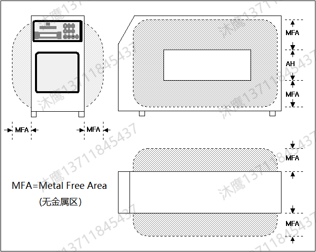 金屬探測器的電磁信號場一般位于探測頭隔離或防護好的內部,但是電磁信號會有一定的發(fā)散性,所以在檢測通道兩側會存在一個“無金屬區(qū)”。通常當金屬探測器頻率為低頻小于200KHz時,“無金屬區(qū)”約等于檢測通道高度的尺寸;當金屬探測器頻率為高頻時,“無金屬區(qū)”約等于檢測通道高度的1.5倍。該區(qū)域不允許存在金屬。