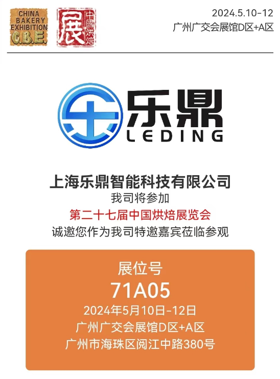 上海樂鼎智能科技有限公司/東莞市沐鷹智能科技有限公司于2024.05.10日在廣州廣交會展館D區(qū)參加第27屆中國烘焙展覽會,展位號:71A05, 歡迎新老客戶過來現(xiàn)場參觀和指導!