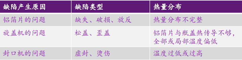 鋁箔片被電磁加熱之后,一方面融化熱封膜完成封口,另一方面通過熱傳導(dǎo)將熱量傳遞到瓶蓋,此時可以通過紅外熱成像相機(jī)捕捉到瓶蓋表面的熱量分布此熱量分布直接反映的是墊片與瓶蓋的壓緊程度,而壓緊程度間接地反映出封口質(zhì)量。當(dāng)有封口缺陷產(chǎn)生時,熱量分布會出現(xiàn)異常,其對應(yīng)關(guān)系如下:
